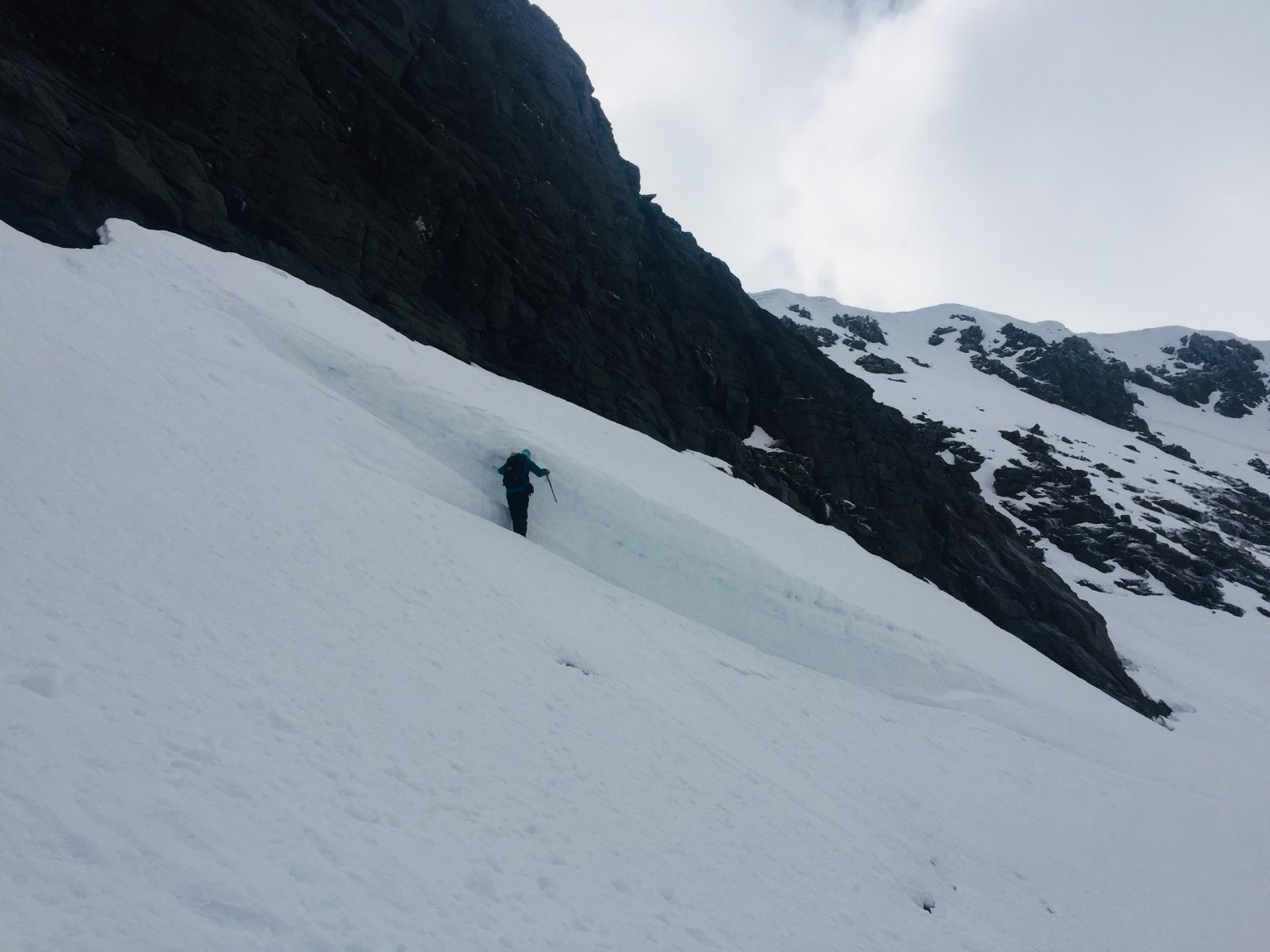 Our journey took us into the coire and up towards ‘The Mess of Pottage’. Here we were able to inspect the impressive crown wall formed by an avalanche that was recorded on the 21st February. Despite the recent rain, we anticipate that at its highest this crown wall is at least 2 metres high.
