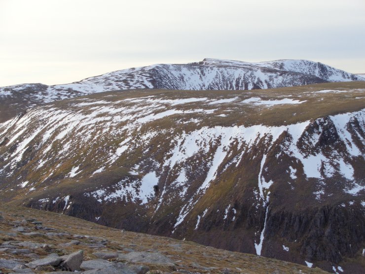Looking across the Lairig Ghru from the west flank of Cairn Lochain across to Cairn Toul (1291m) and The Angels Peak (1258m) on the right. A frozen Lochan Uaine just visible.