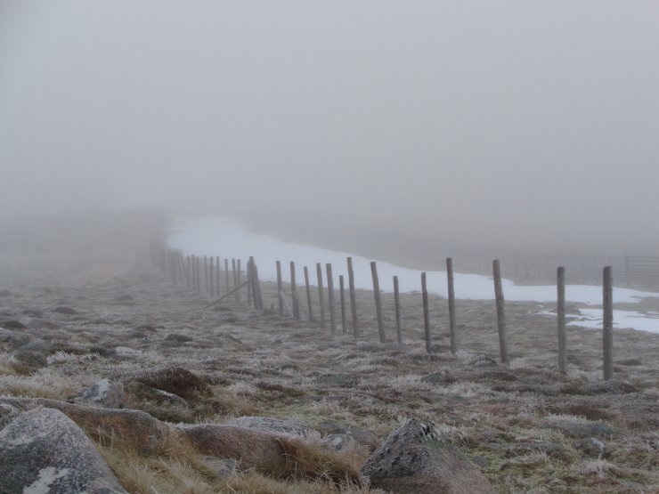 Dense, low cloud shrouded the Northern Cairngorms today delivering damp and grey conditions. Temperatures in the glen were ‘warmer’ than of late, reading a barmy -3 in contrast to the -8 we have been experiencing. The weather forecast suggested mist and fog on the summits for the whole day so any anticipation of the stella views from yesterday were dismissed.