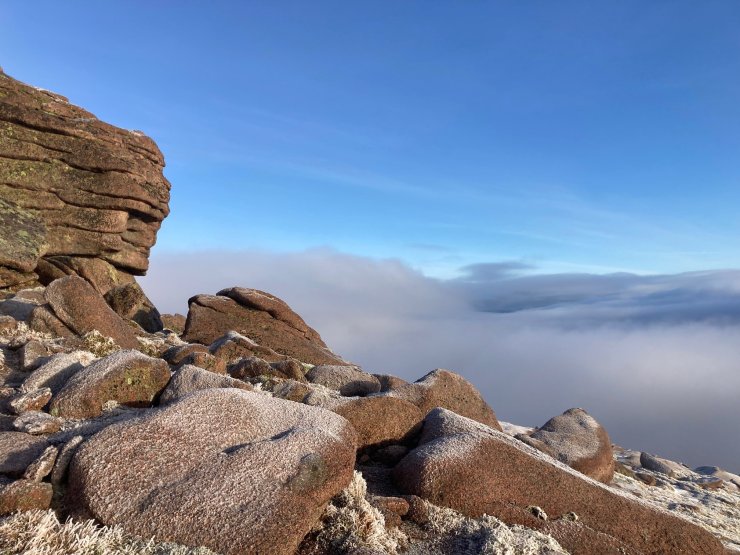 Looking NE from the Cairngorm summit tor into an azure blue sky. Then all too quickly the cloud rolled back in…..