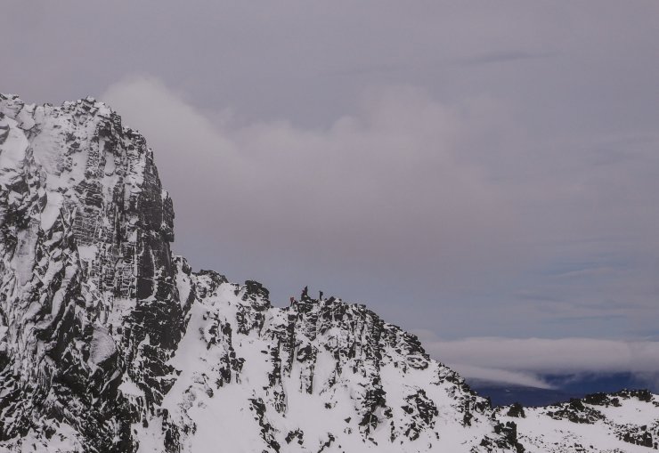 A party on the crest of Fiacaill Ridge. The crags were superficially white today but the sound of ice and rock fall was ever present.