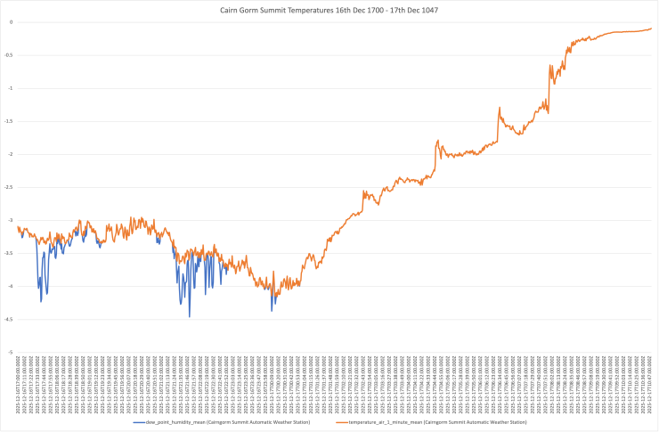 This plot shows the temperatures from the 16th December at 1700 through to the 17th December at 1047. On the bottom axis the times are listed along with Z = ZULU which is the designation for GMT. Blue = the dew point humidity mean i.e. representative of the Wet Bulb Temperature while Orange = the Air Temperature mean. The overnight temperatures were relatively low with periods when the humidity dropped resulting in showers falling as snow at lower elevations. However, temperatures soon rose, and at 1500 the temperature is showing as +2.3 Degrees Celsius. Inevitably, this has resulted in the thaw of superficial snow at all levels today. Finally the Met Office observation station viewer was suggesting that the data wasn’t reliable this morning, and it may have been warmer than the figures shown. As mentioned in previous blogs one theory is that measurements are sometimes frustrated by the presence of rime ice and water giving temperatures around the triple point 0.01 Degrees Celsius or 273.16 K. (c) Met Office.