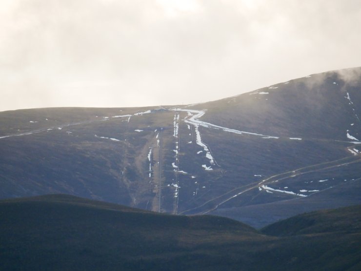A distant view of Cairn Gorm just after dawn. Note the snow holding along the snow fences of the ‘traverse’ into Coire Cas. The more extensive snow on the right of the image is on the headwall of Coire Cas with Pt 1141 on the right.