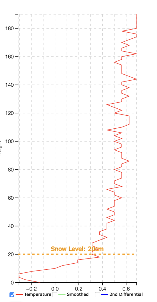 Coire Cas SIMBA Data. Generously supplied by Sams Enterprise (copyright). The snow may have largely gone from this site, although these may be some snow and ice close to the base of the sensor chain. In deeper snow this allows us to see temperatures through the snowpack. Ultimately this gives an indication if the snowpack is stabilising or potentially becoming weaker.