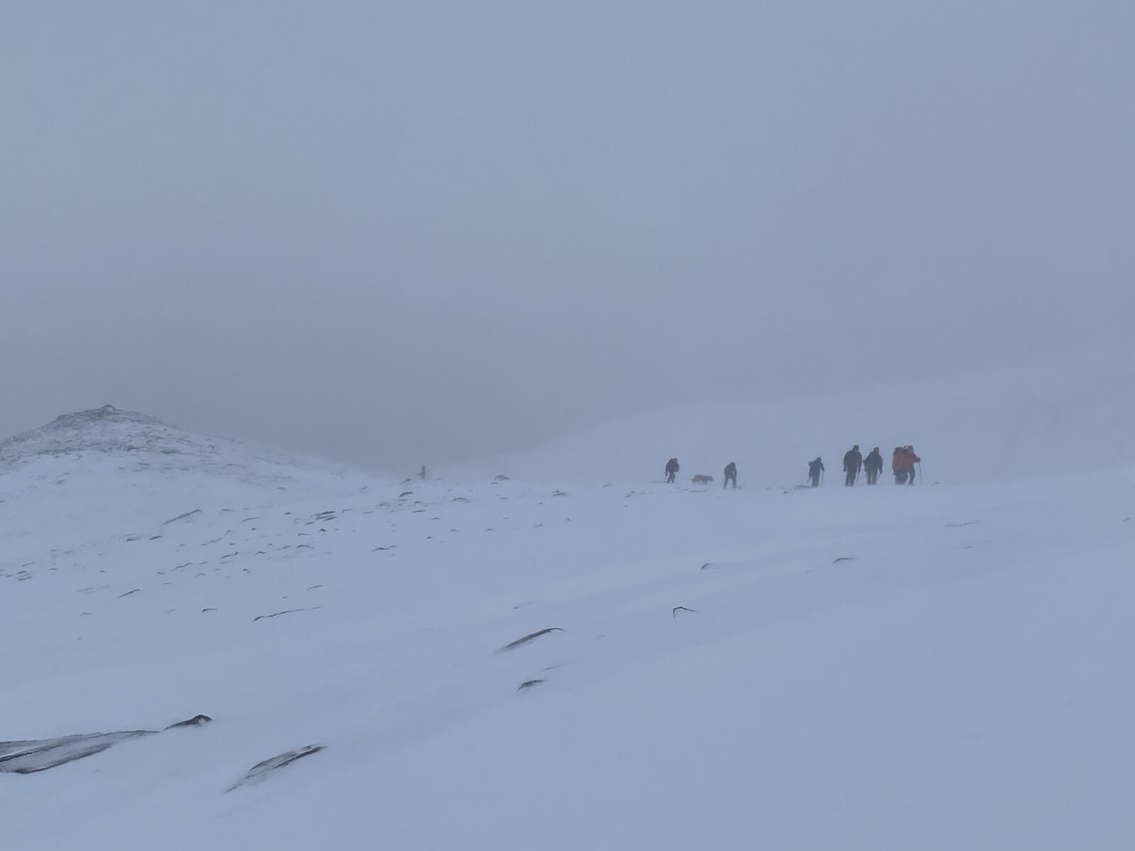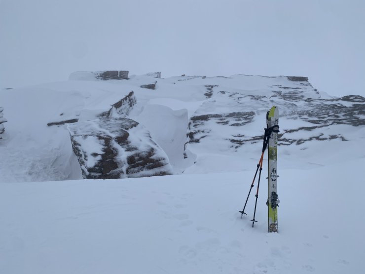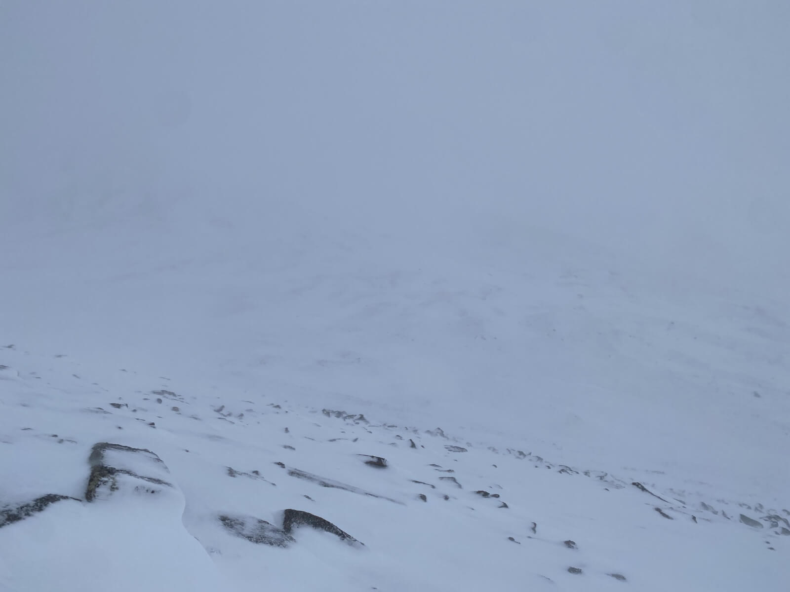 South-Easterly winds continue with light snowfall, this was drifting above 800 metres.  Although conditions were still windy with poor visibility and drifting it was a busy day in the Cairngorms.  The terrain is a mix of firm windslab, icy wind scoured snow ice and softer windslab in the most wind sheltered areas.  Thaw conditions below 600 metres were deep accumulations remain on the lower slopes after yesterday’s snowfall.