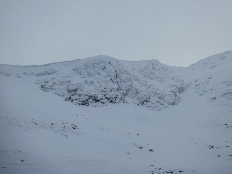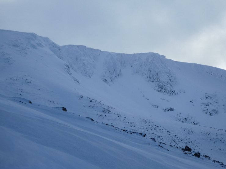 The Mess of Pottage, in Coire an t-Sneachda. It may not be visible in this image but there is a small crown wall at the bottom of the rocks (centre right) with partially covered debris. Directly above this there is an old crown wall in the snowfield just below the coire rim. This small scarp slope readily collects snow in south-easterlies and is known to purge snow readily. This may have occurred in previous days during intense drifting resulting in the subsequent release on the crag apron below. For the climbers it is immediately to the left of the top pitch of “Yukon Jack’ and presents an overhead hazard in sub optimal conditions.