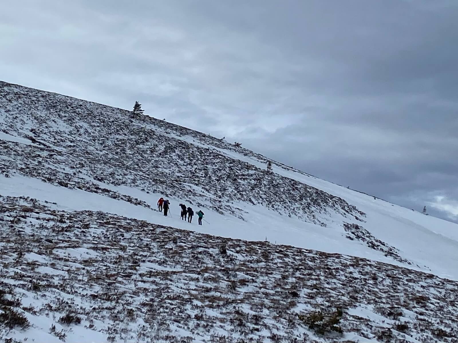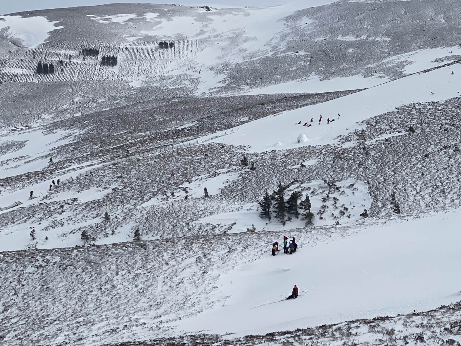 Groups making the most of the snow patches at lower altitudes where it was less windy.