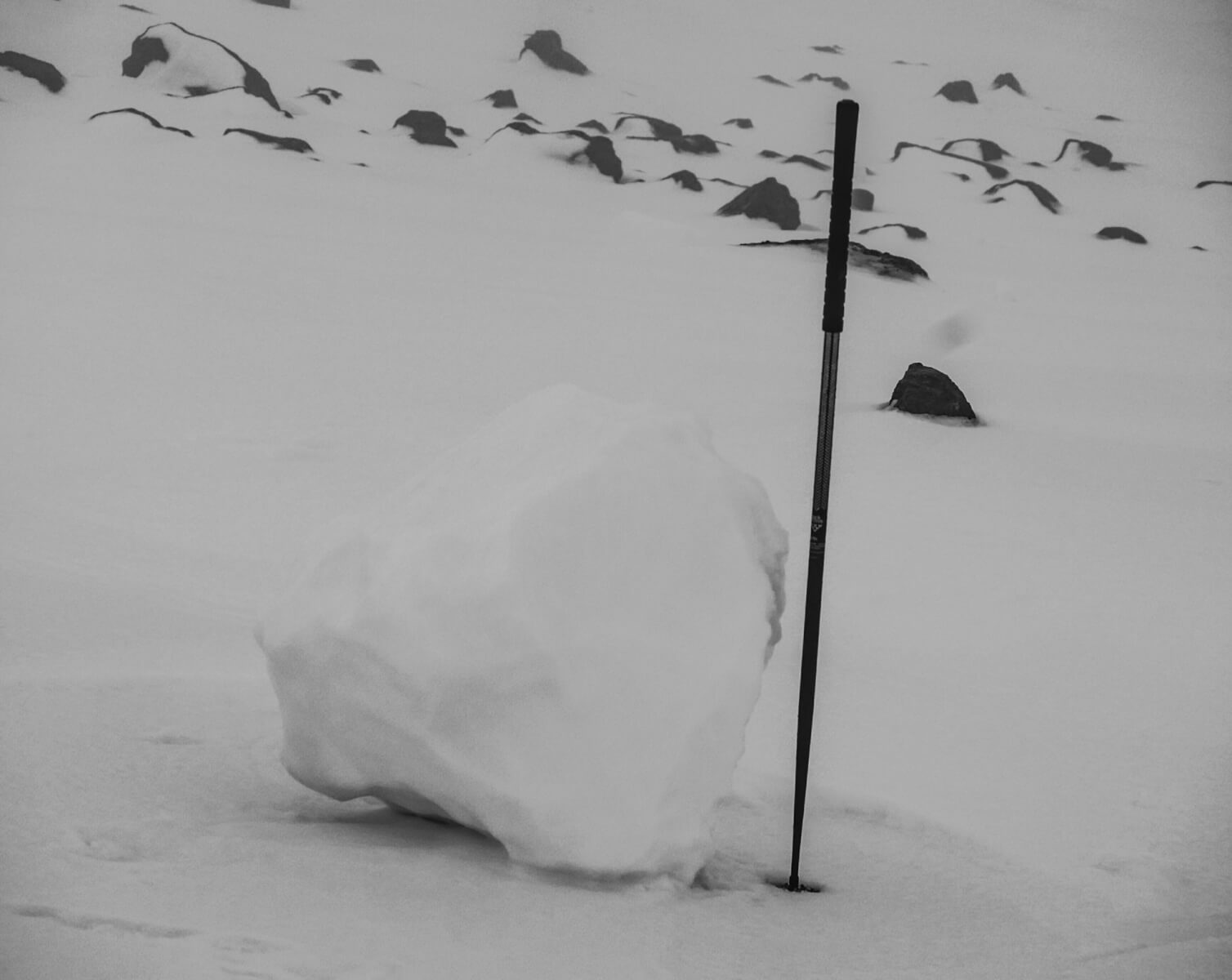 A large chunk of cornice debris had run out to the coire floor at 950 metres. 125cm long pole for scale. I am sure there was other debris close by, but the visibility was appalling.