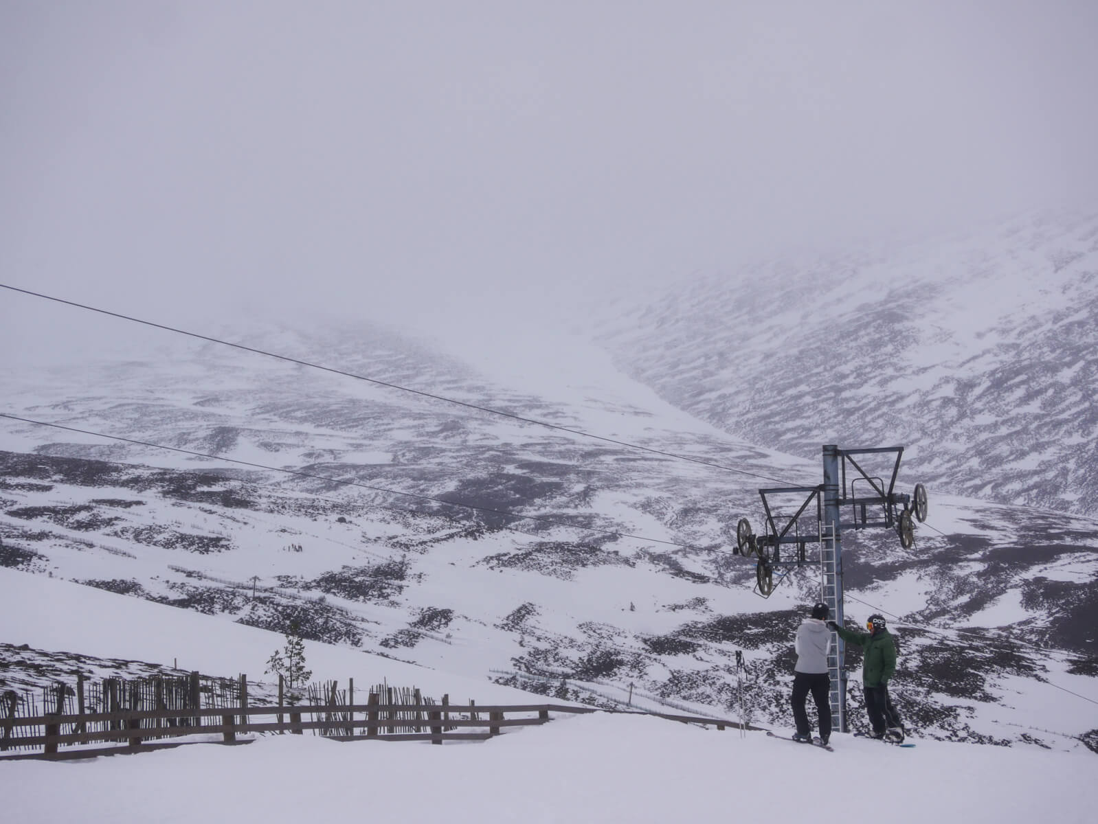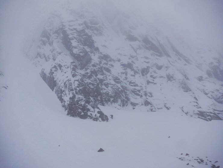 A fleeting glimpse of Aladdin’s Buttress, Coire an t-Sneachda. Two climbers visible. Not a bad choice as this left hand side of the buttress can be climbed with an abseil descent, therefore avoiding the slopes above or a descent of Aladdin’s Couloir. Evidence that climbing is possible for those with the pre-requisite skill, experience and the ability to put up with damp horizontal sleet.