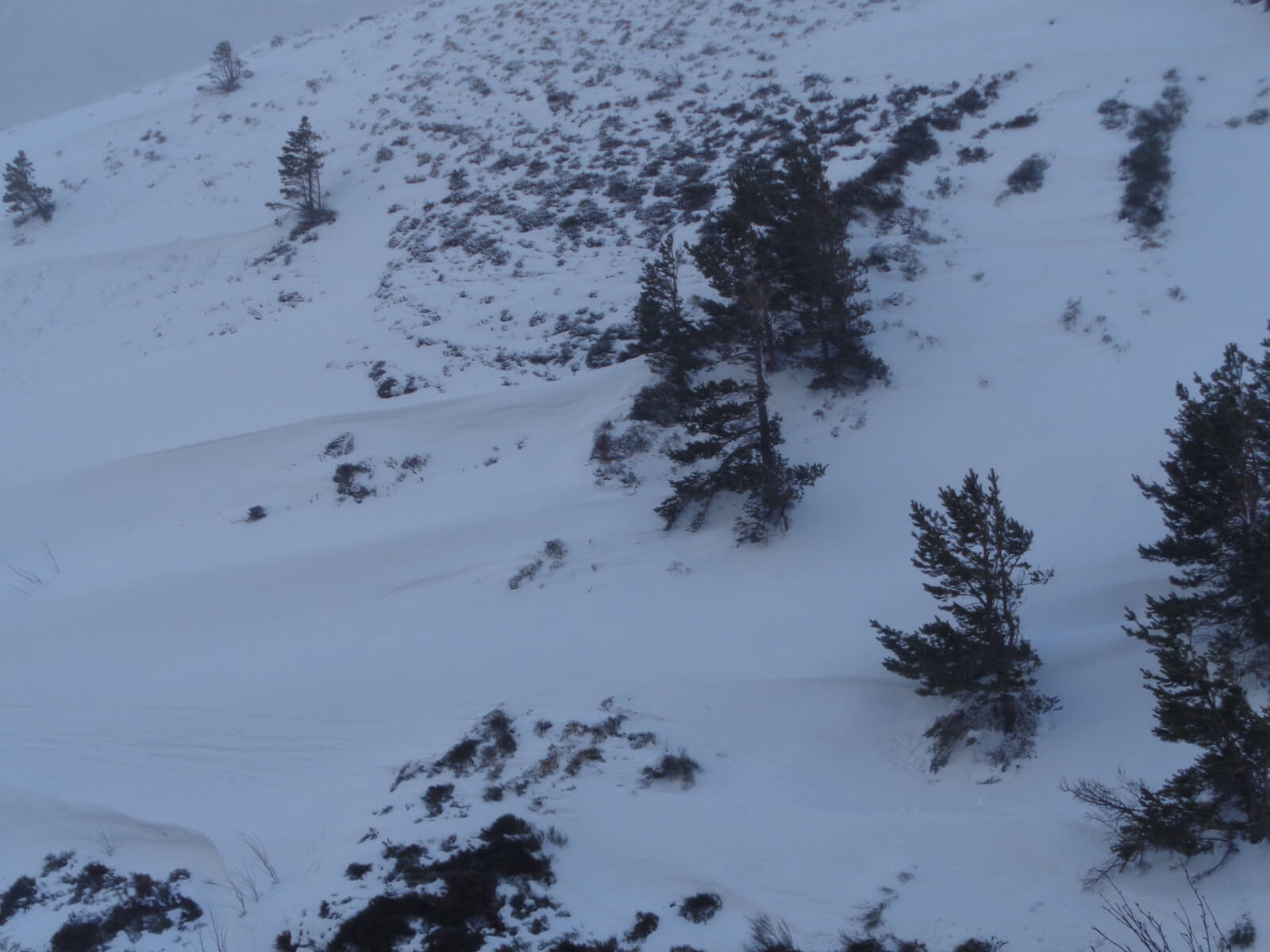 There is a lot of drifting snow, which continued throughout the day. Accumulating in every leeward depression below 800m. Burn lines, gully lines, depressions, convexities, glacial overflow channels (such as the Chalamain Gap) particularly affected. Above 800m West to North aspects will be building considerable amounts of windslab, here avalanches are likely. North-East and South-West aspects are also affected due to cross-loading.