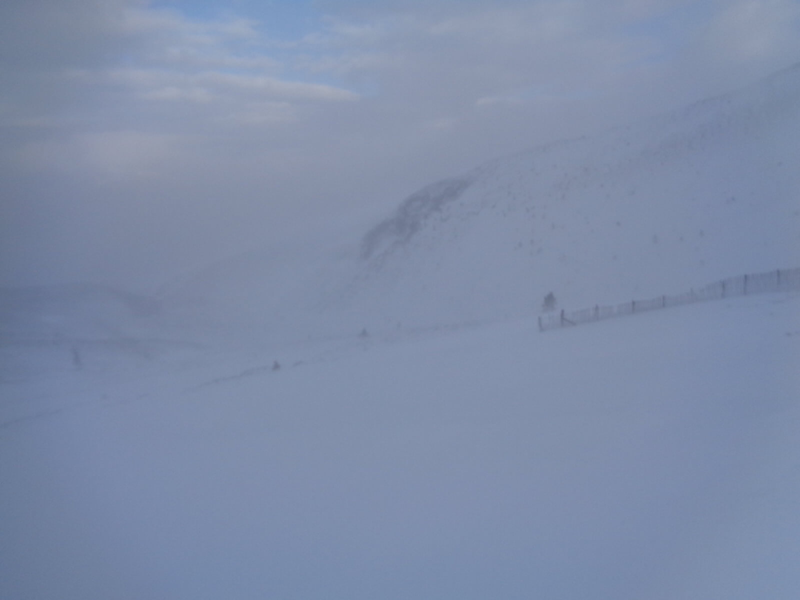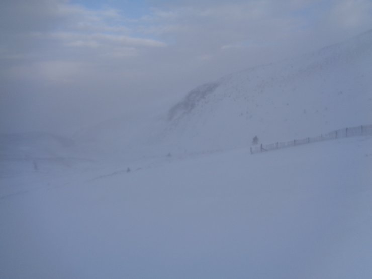 Cairngorm Mountain was stormbound today; snow gates closed all day at the Hayfield. Frequent, light snow showers, winds gusting 50mph at 500m and a freezing level of around 400m. Underfoot conditions at mid-elevation ranged from deep, soft windslab to hard/icy then breakable crust in places. This combined with the gale force winds made getting anywhere slow and tedious.