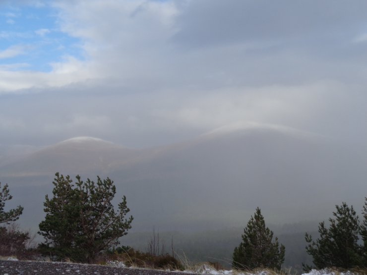 The South-Easterly winds continue. Locally known as the ‘Full Monty’ here in the Northern Cairngorms as the wind rips across the plateau areas and accelerates down into the Northern Corries. Often proving windier at mid-elevation than on the high tops. The ‘tell tail’ cloud cap holding over the mountain tops is a sure sign the ‘Full Monty’ is making its presence felt.
