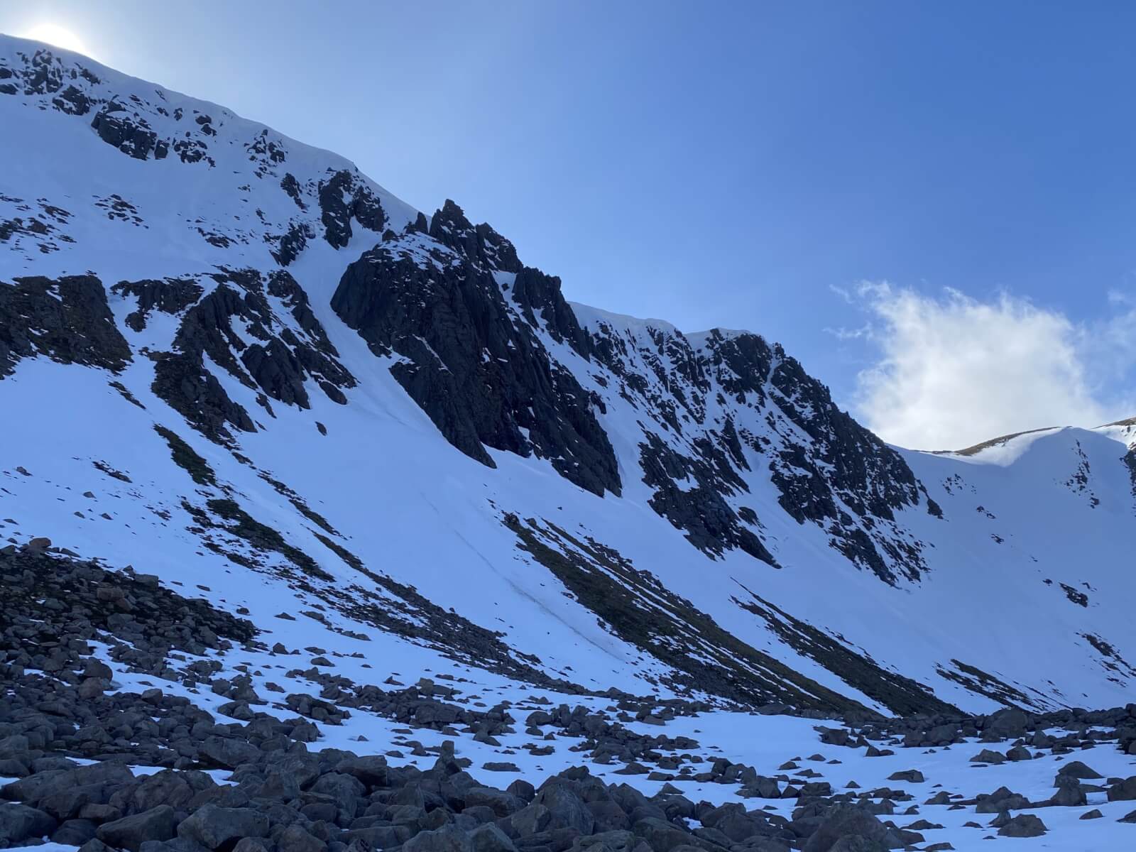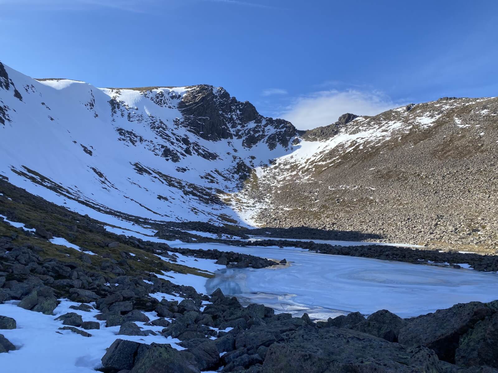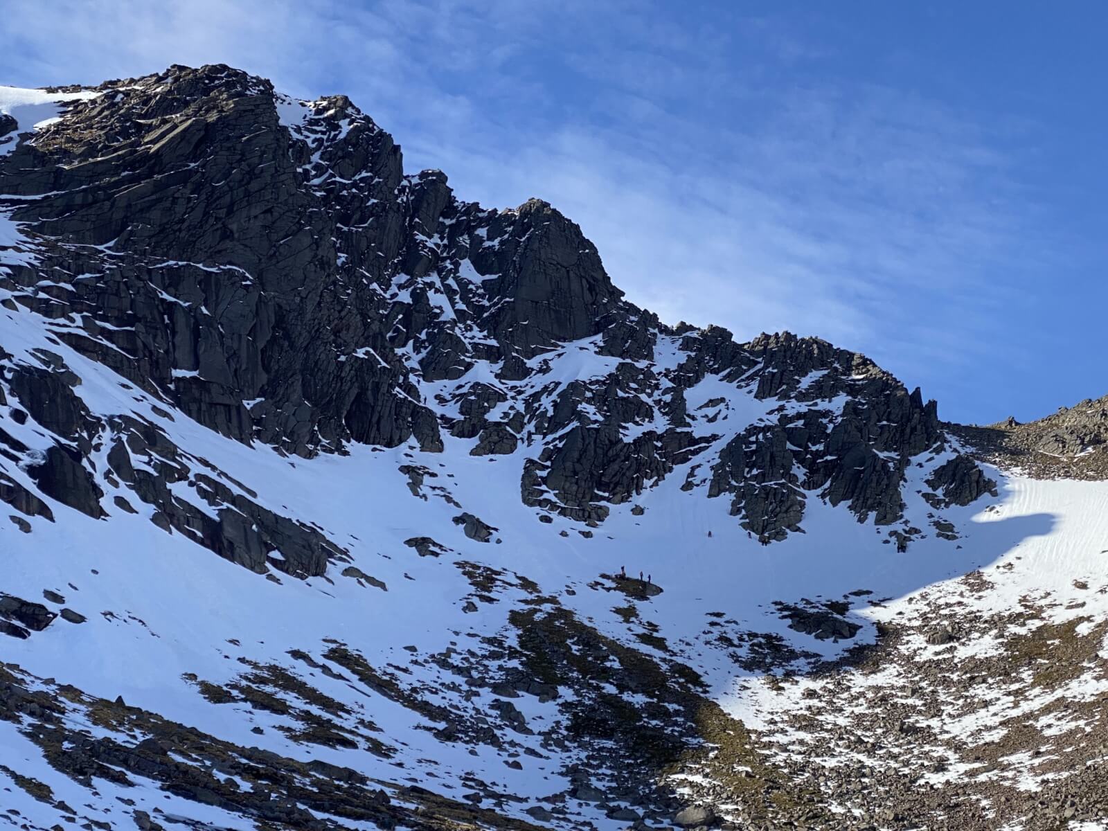 This rock fall on a Westerly aspect happened a couple of weeks ago during a mild spell. One of the larger boulders ran to the corrie floor.
