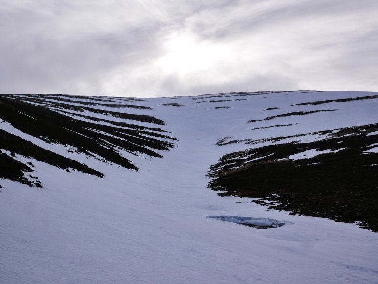 As expected the snow was very firm today, icy even on the wind blasted upper slopes of Braeriach. Such firm and icy conditions were sub optimal for travel on ski, and today’s sortie was accompanied by constant anxiety. An uncontrolled fall or slide would have been consequential to say the least.