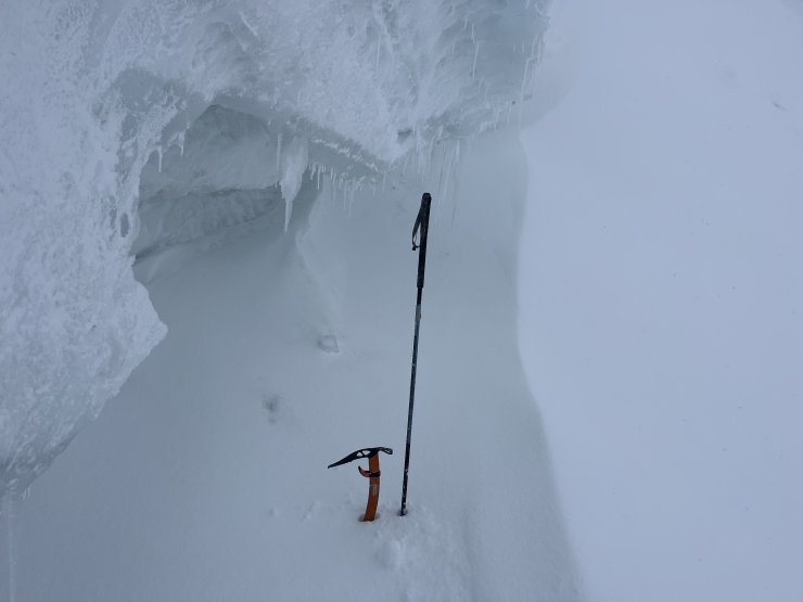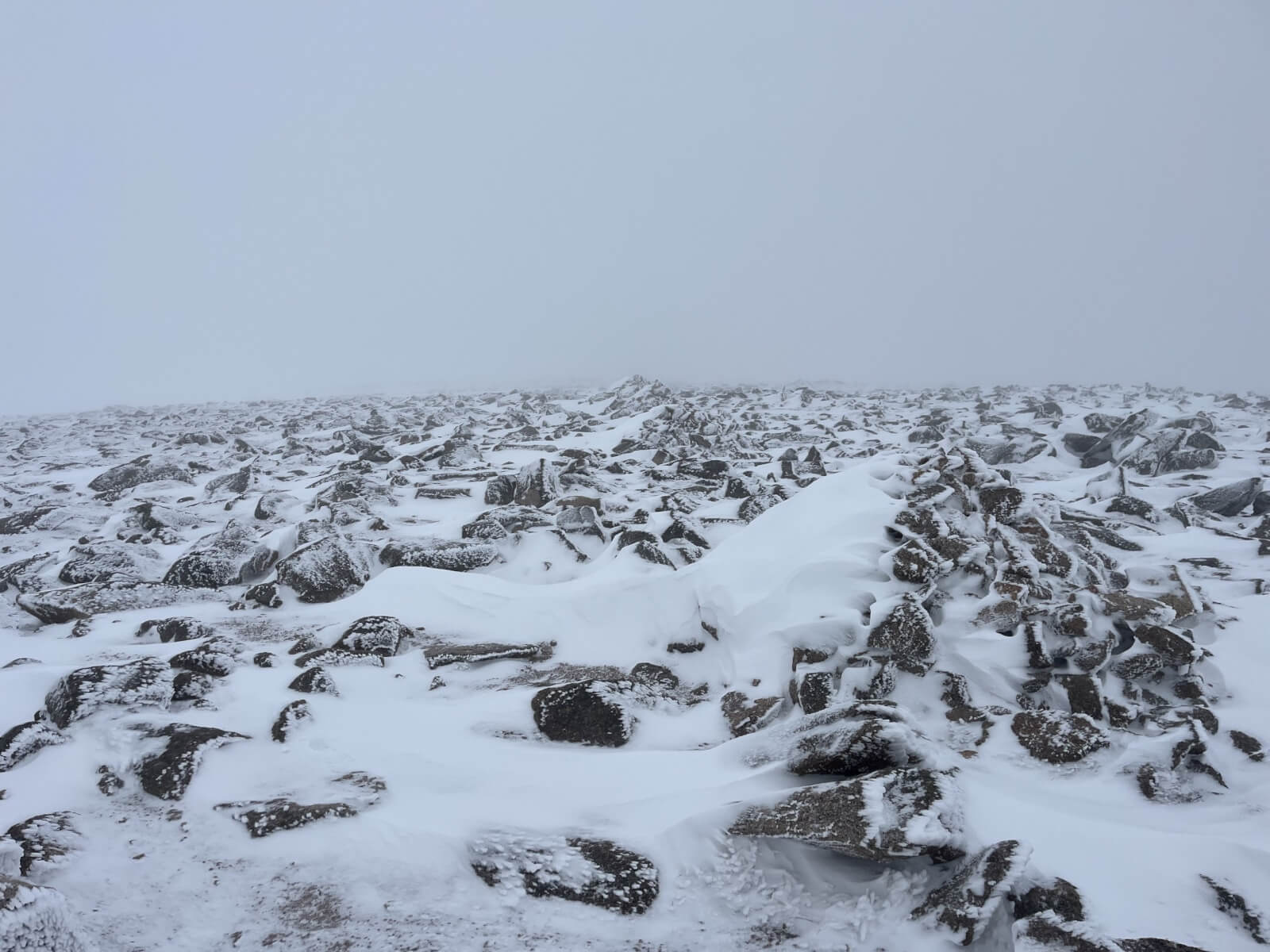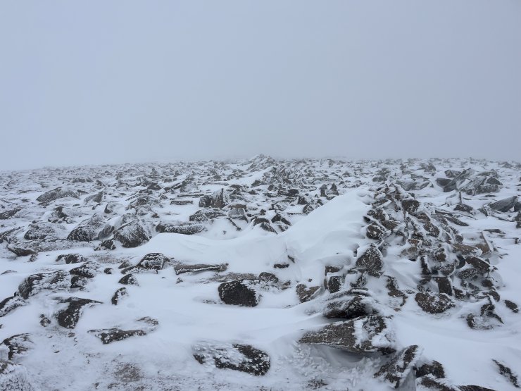 The above hillside is the northerly slopes of Cairngorm. The wind blowing from right to left across the slope has cross-loaded the sheltered side of the cairn, depositing fresh snow. A useful observation which can be representative of similar slope aspects in steep terrain.