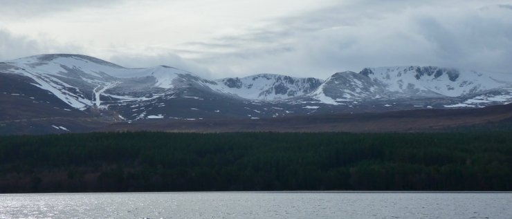 Early morning view across Loch Morlich towards Coire Cas and the ski area (left), Coire an t-Sneachda (centre) and Coire an Lochain. There was a light dusting of snow down to 950 metres.