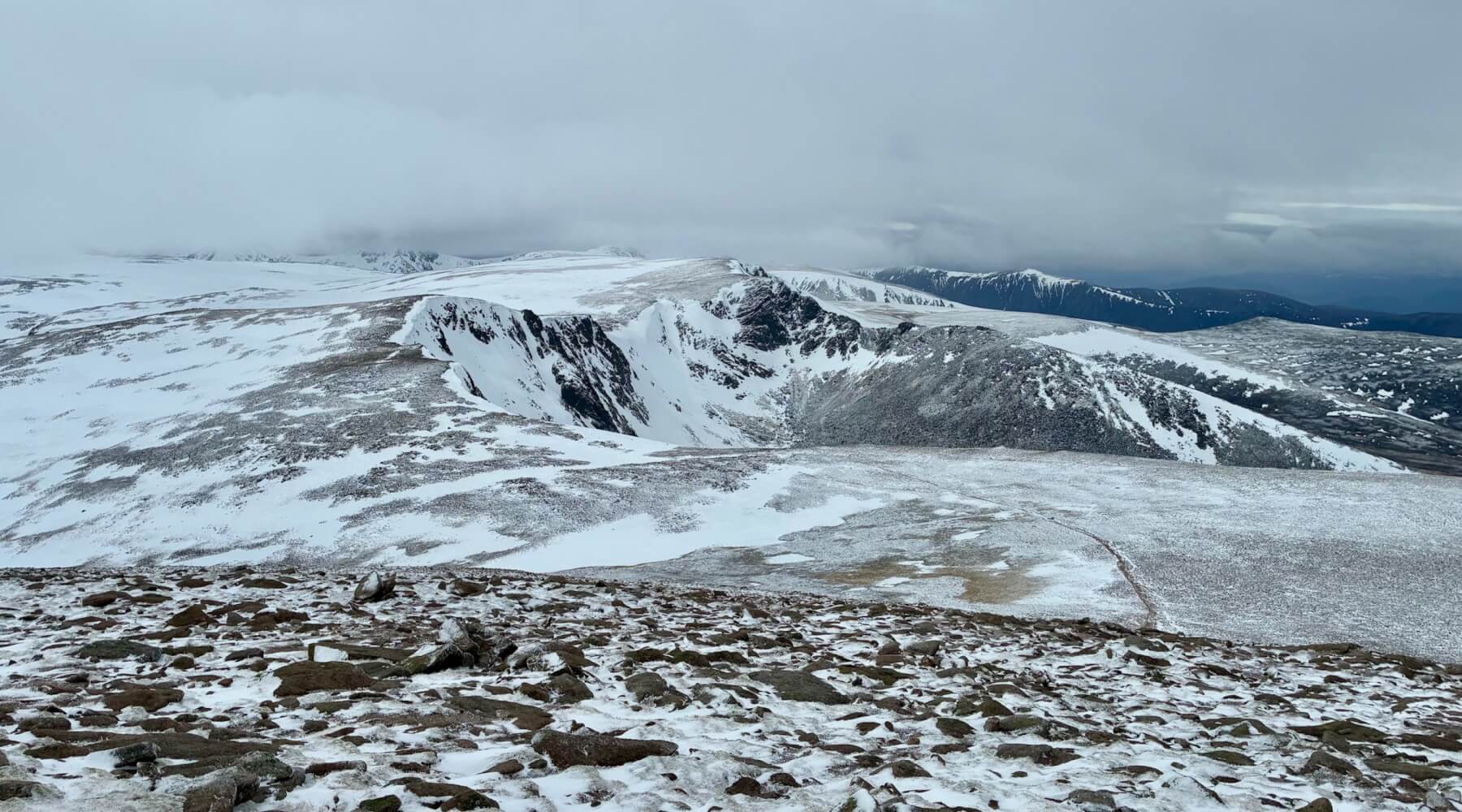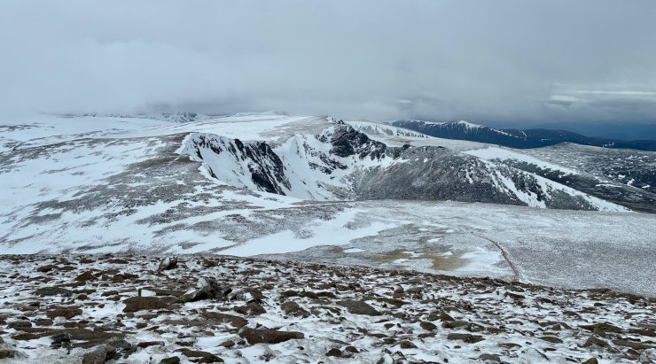 It started out as a relatively calm day but the Southerly winds rapidly increased to gale force making progress challenging. It was bitterly cold too, feeling like -12 degrees Celsius with the windchill taken into consideration. The old snowpack was firm and icy throughout, quite a change from the soft spring snow conditions of yesterday.