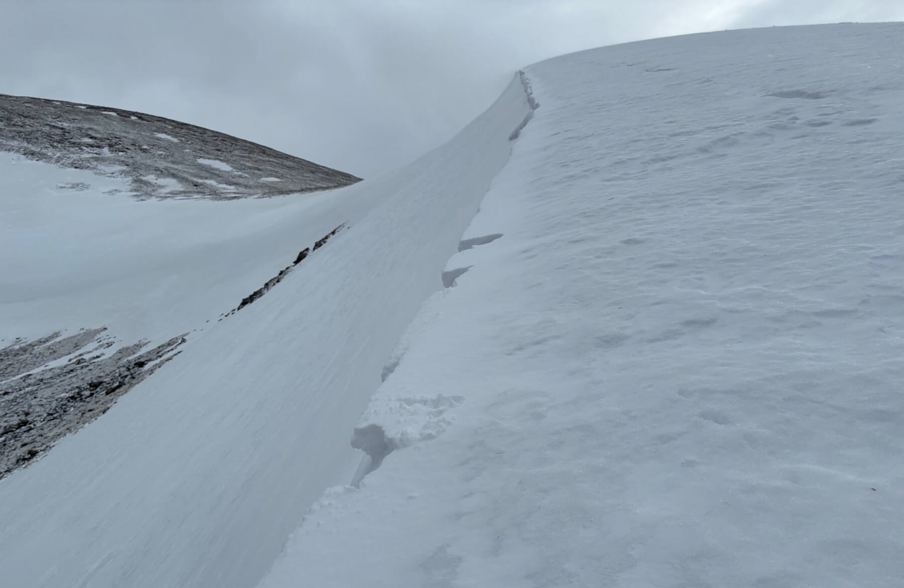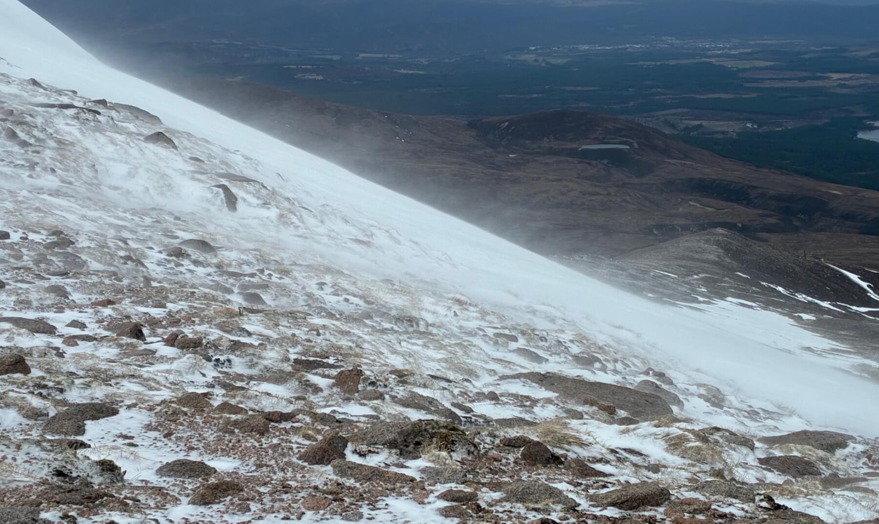 The Southerly winds rapidly increased in strength throughout the morning and the fresh snow was being blown and deposited onto Northerly aspects.