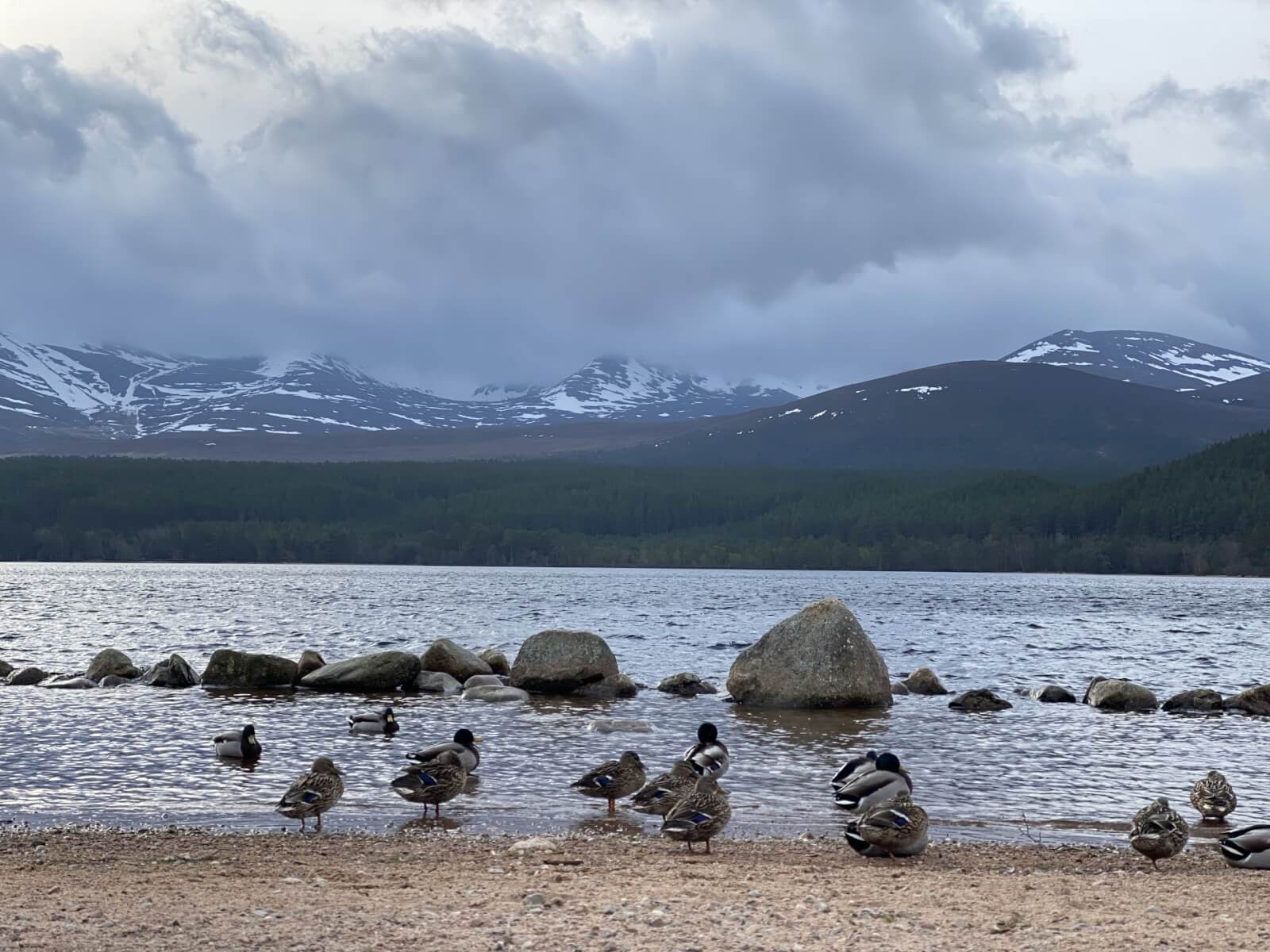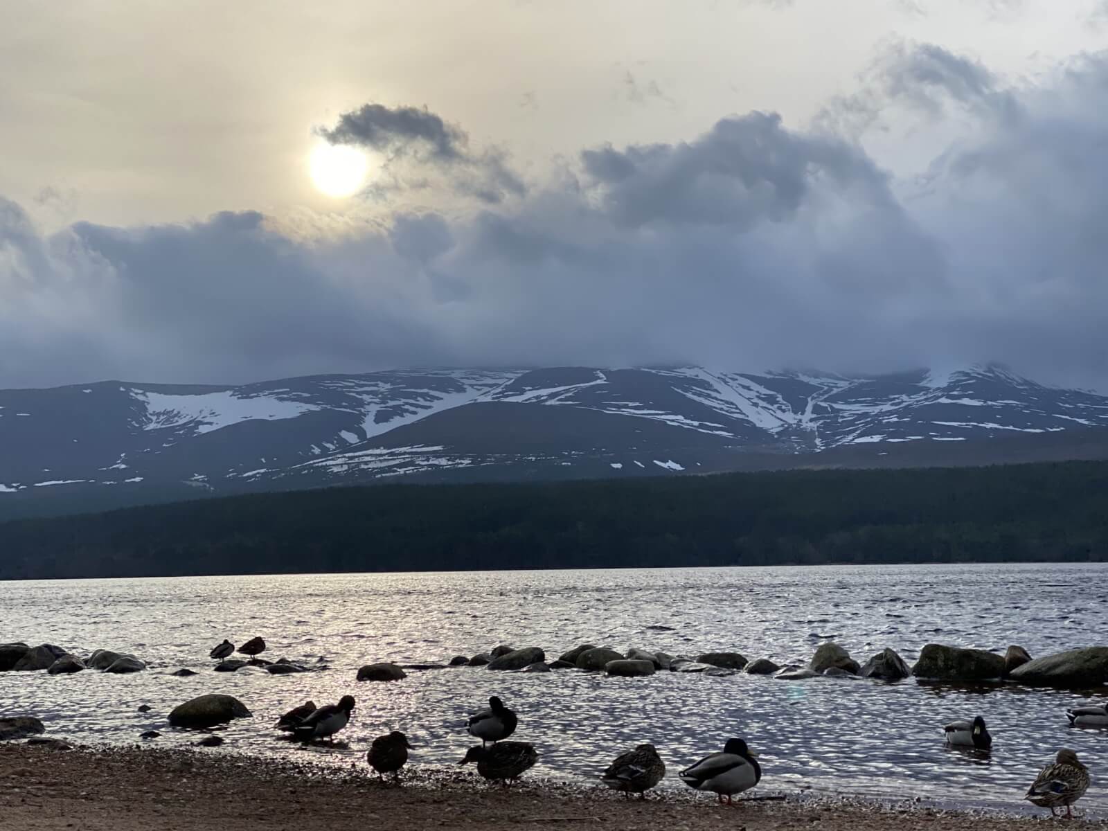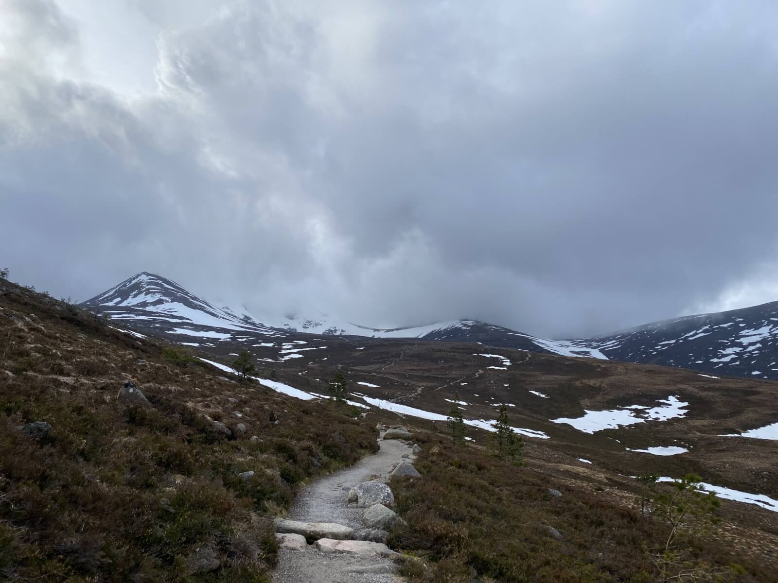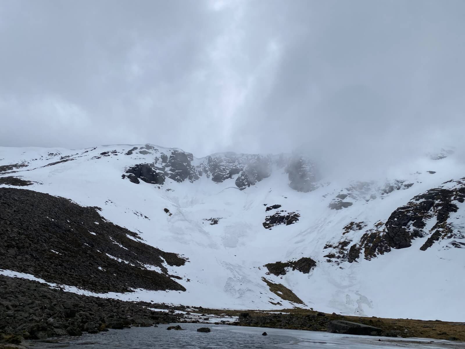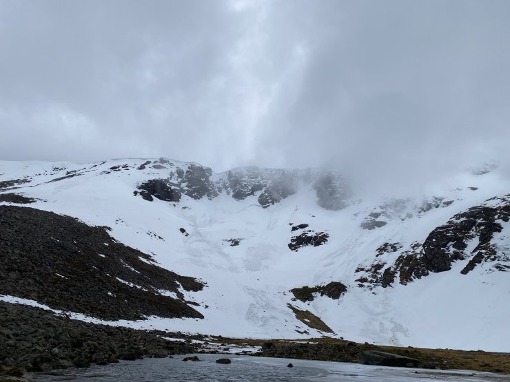 A dry mild and cloudy morning before the onset of rain during the afternoon, this later turned to snowfall at summit levels. Gale force winds gradually eased. Although snow cover is still extensive around coire back walls and higher up on ridge flanks, rockfall continues to be a potential hazard.