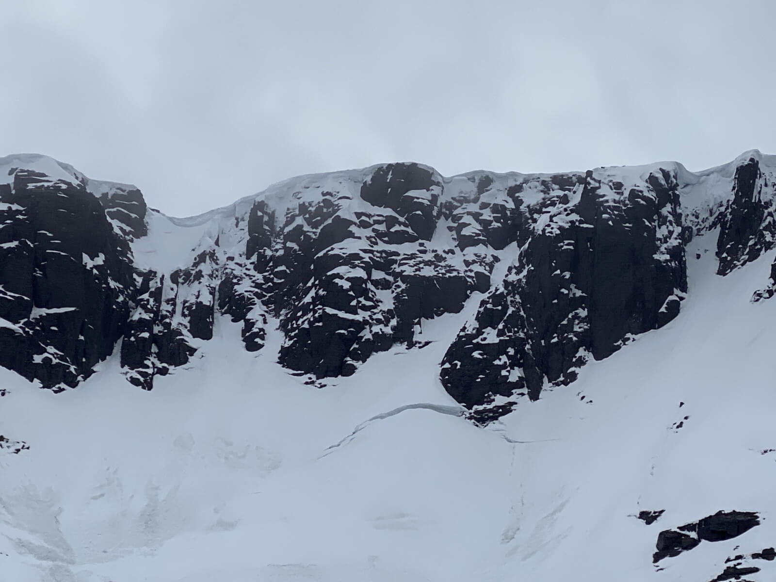 A general view of the Coire an Lochain Buttresses and slopes below, note the evolving glide crack due to thaw conditions.