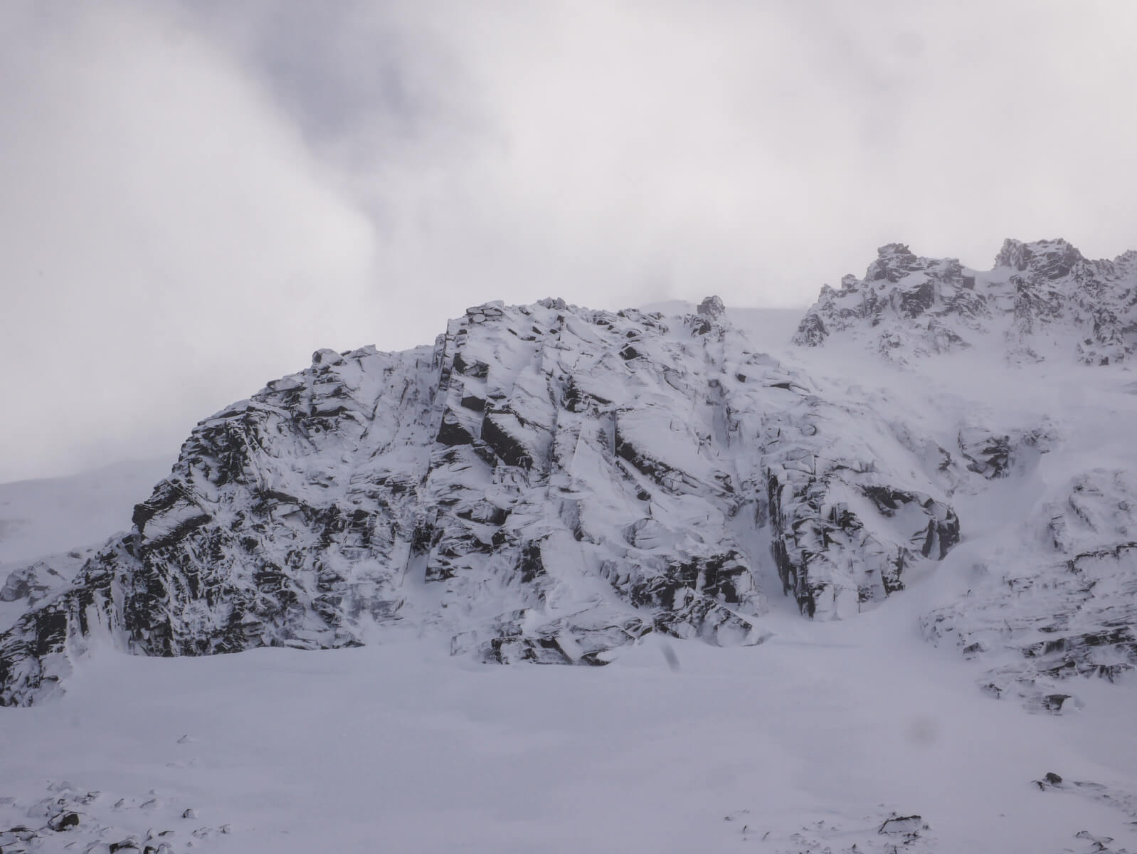 A transient bright spell allowed me to get this image of Alladdin’s Buttress. Well plastered in the current colder conditions.