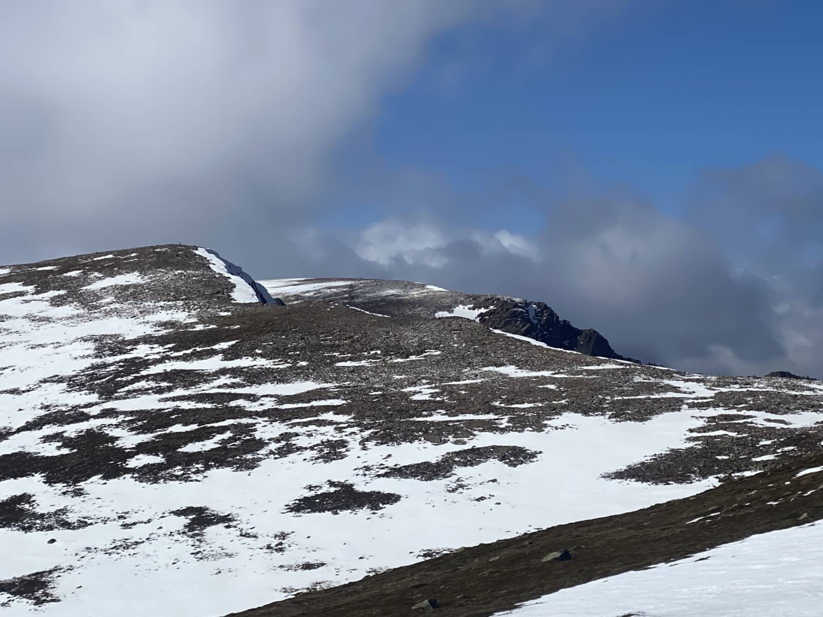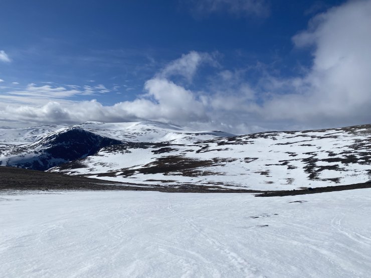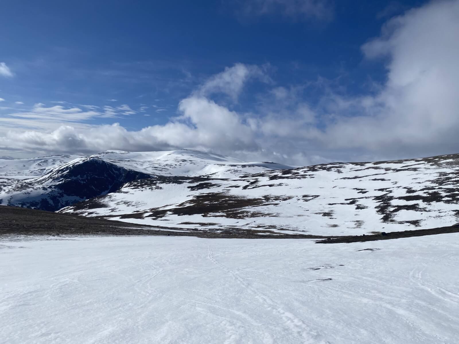 From the South side of Cairngorm, views across the plateau with Ben Macdui in the distance.